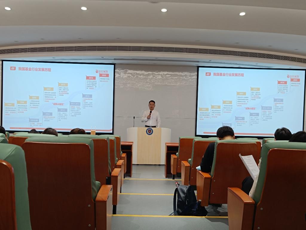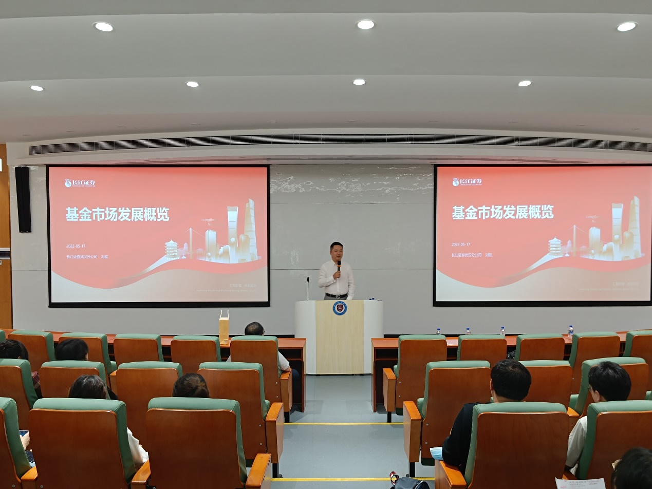 2023年5月17日晚,“经济讲坛”系列活动之“企业实践讲座”在鸿博楼J1报告厅举行,长江证券武汉分公司总经理刘歆带来了《基金市场专题概览》的专题讲座,22级金融专业学生参加了本次活动,活动由金融教研室崔北庆老师主持。