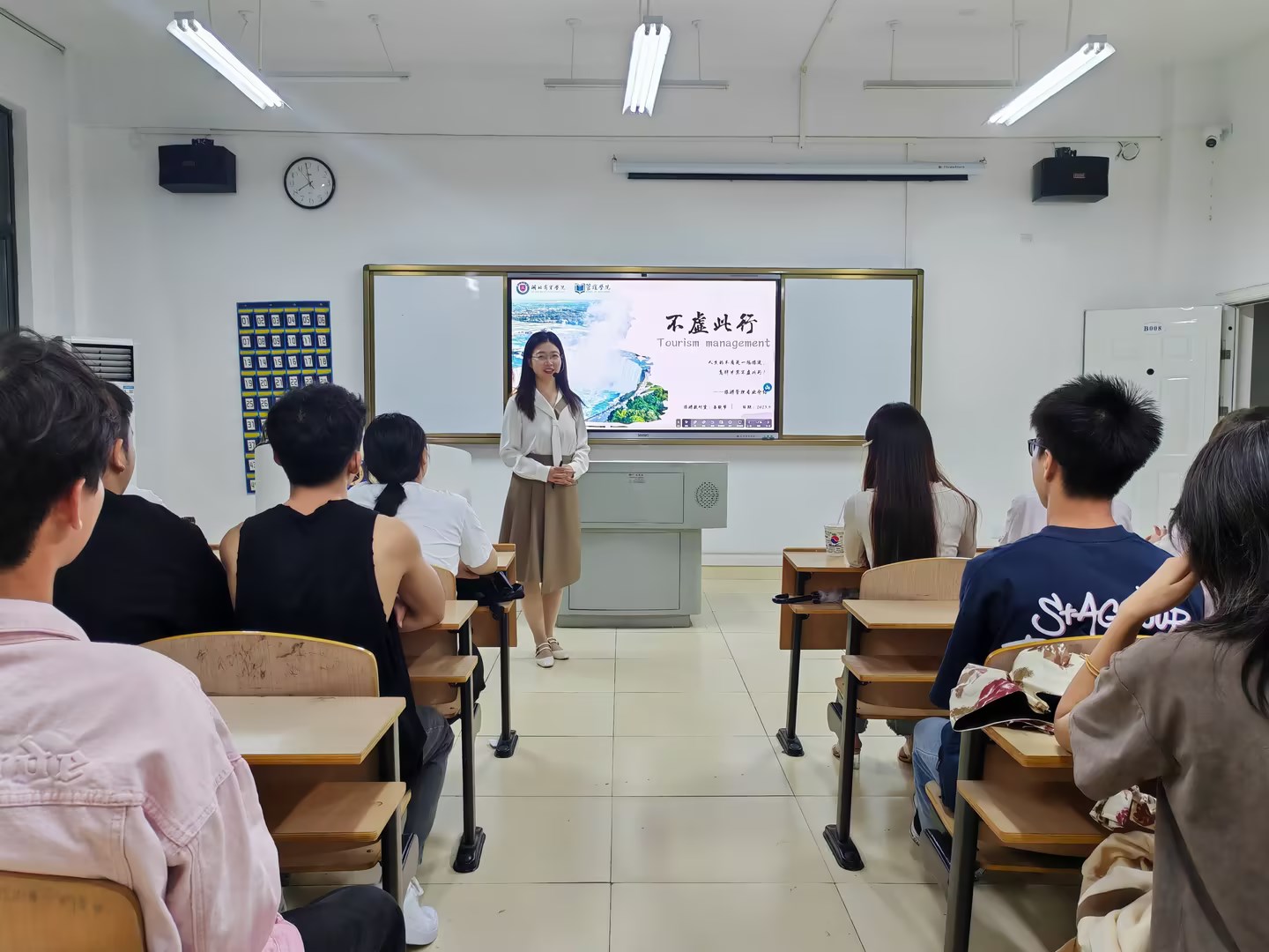 2023年9月20日,管理学院2023级专科旅游管理及酒店管理新生齐聚教学楼,在XJB-007和XJB-008两个教室,旅游教研室主任曹珍珠、专任教师苏晓梦及华住集团校企合作负责人陈雯分别为两个专业的同学们进行了细致的专业介绍。
