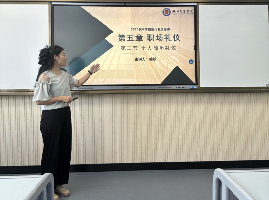 胡宇老师作为首次加入授课团队的教师率先进行展示,主要围绕职场礼仪中求职面试礼仪与技巧的内容进行介绍,回顾了面试准备中心理准备的主要内容,重点讲授了服饰准备,角度新颖,具有启发性。其他老师在点评中提出了宝贵的改进意见,如课件的设计、教姿教态的完善等。