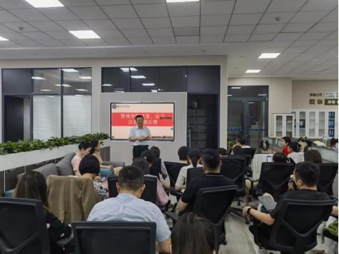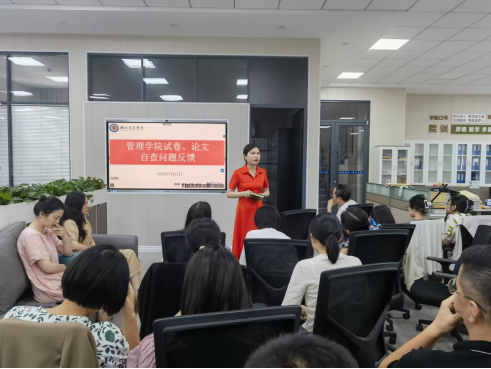 2023年7月12日,管理学院召开试卷、毕业论文问题专题反馈会。院长严良、副院长徐刚、孟静再次强调关于试卷、毕业论文的要求及规范。
