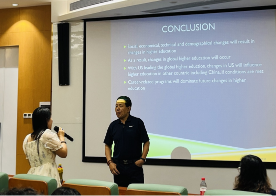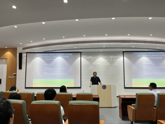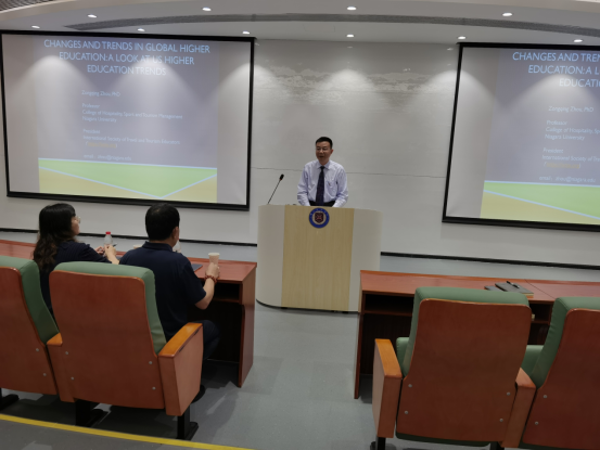 周宗清教授提出随着社会、经济、技术和人口的变化,当前美国高等教育正面临很多变革,大学与社会深度融合的需求越来越强烈,未来高等教育高质量发展的关键是科教一体,产业融合,在人才培养、专业设置、课程设置方面要紧紧围绕时代发展同频共振。周宗清教授以美国尼亚加拉大学旅游与酒店管理学院为例,为了适应时代发展进步,新增设了智慧旅游专业,该专业是信息技术在旅游产业中的创新性应用,为了拓宽学生的视野和知识面,在课程设计方面该专业还新增了商业类课程、体育类课程、拓宽职业选择的服务相关课程。