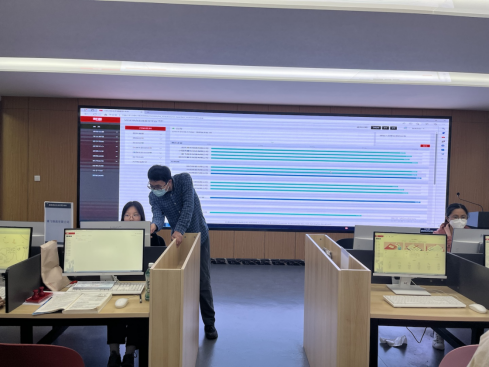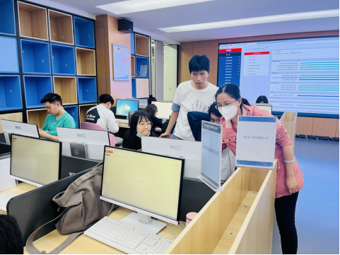 张博和刑萌老师在《经管会跨专业综合实训》现场指导学生进行经营模拟训练,采用讲训结合的方式,提高学生的动手能力。