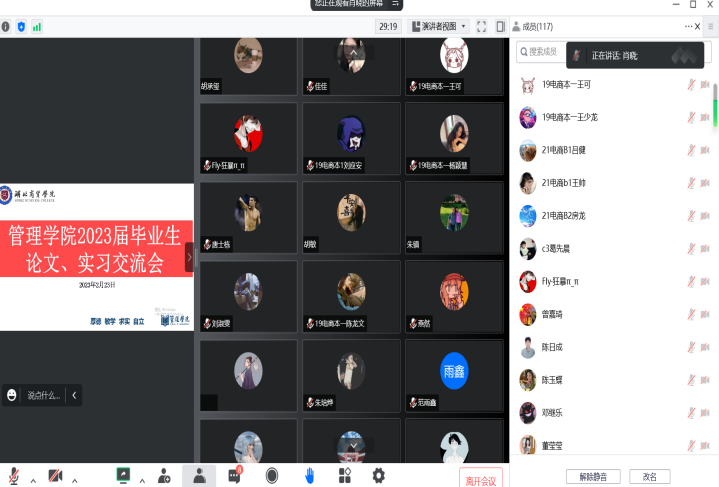 2023年3月1日中午,为督促毕业生积极保质保量完成论文,提升毕业班学生就业技能、增加就业筹码,电子商务教研室召开了2023届毕业生论文、实习交流会。管理学院副院长孟静、教研室主任肖晓、电商教研室全体教师以及2023届电子商务专业毕业生参加了此次线上交流会。本次交流会孟静和肖晓明确强调了毕业论文和实习对学生的重要性,针对毕业论文提出时间节点和质量方面的具体要求。
