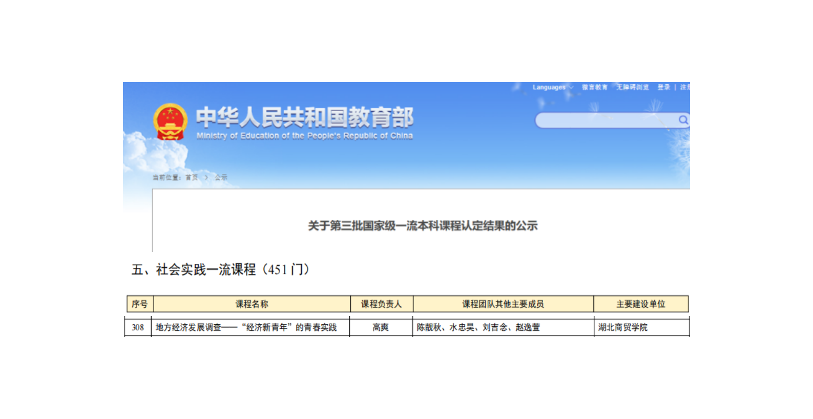 8月21日,教育部公示第三批国家级一流本科课程认定结果,yl7703永利集团高爽老师主讲的《地方经济发展调查——“经济新青年”的青春实践》成功入选“社会实践一流课程”。这一成果不仅是学院课程建设的重大突破,更实现了学校在国家级一流本科课程领域的“零的突破”,标志着学校的教学改革与课程建设迈入新阶段。