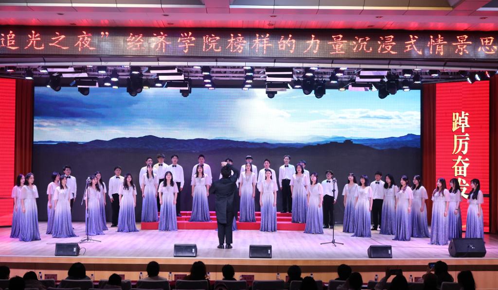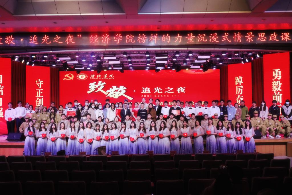 当晚,“致敬·追光之夜”经济学院榜样的力量沉浸式思政课正式开课,课程以情景演绎、讲述和合唱的形式再现了从革命战争年代到新时代的青年人以青春之我,向榜样学习,报效祖国的时代身影。经济学院党总支书记吴俊、院长陈靓秋、副院长陈红兵及全院老师、青年学生参加活动。课程由经济学院团委书记谢志洋、学生党员胡萌萌主持。