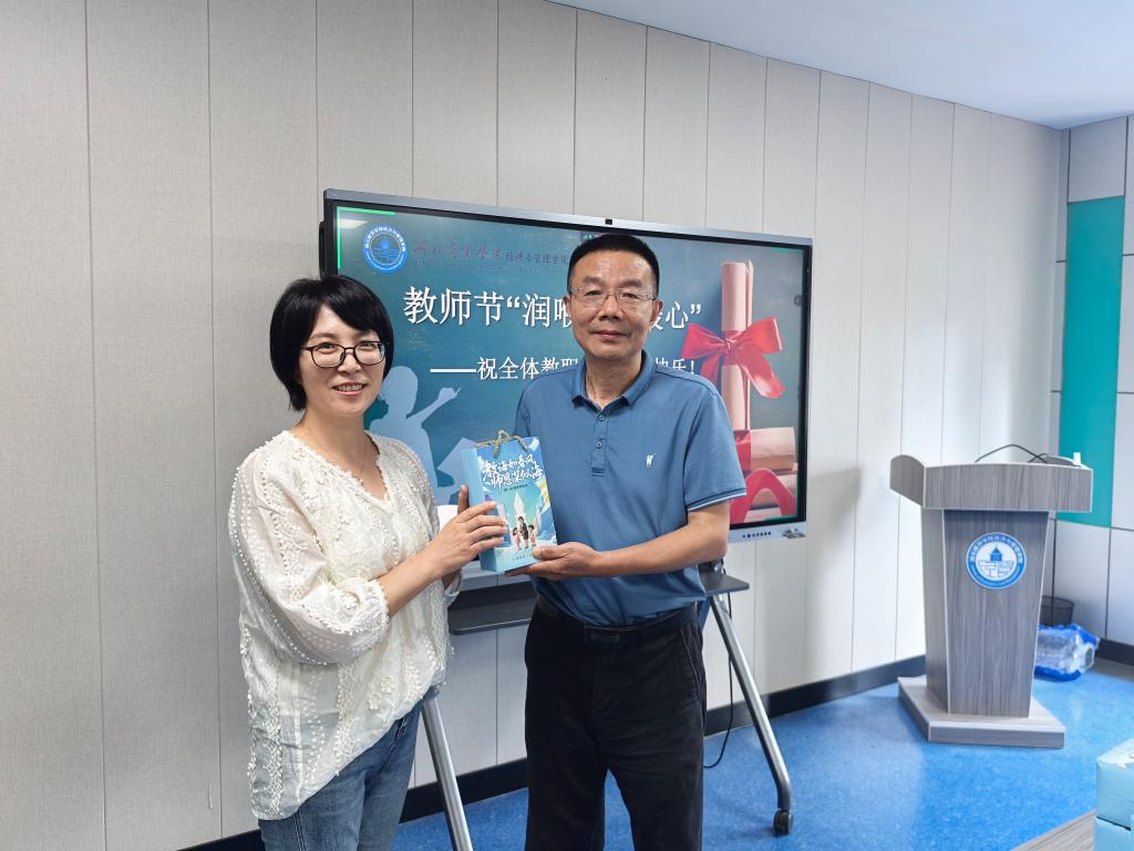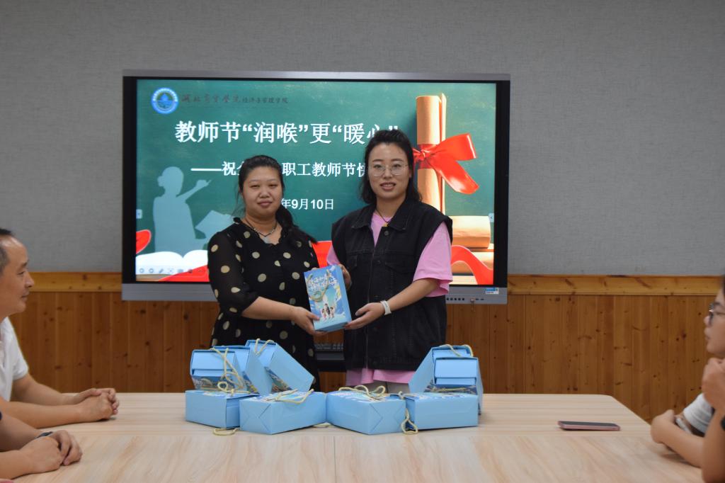 与此同时,咸宁校区的教师节慰问活动同步开展。学院副院长徐刚、党总支副书记郑燕培将包装精美的润喉糖逐一送到教师手中,向大家致以节日的祝福。
