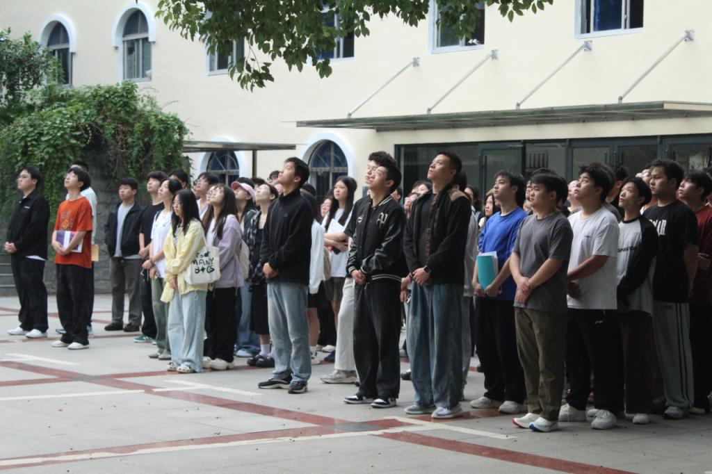 学生代表魏依伶与丁保坤依次发表国旗下讲话。魏依伶以“探月逐梦,科技报国”为题,结合我国探月工程分享道:“从‘嫦娥奔月’的神话到‘嫦娥五号’带回月壤,中国航天人以‘上九天揽月’的壮志,书写了科技报国的壮丽篇章。作为新时代青年,我们当以他们为榜样,在专业学习中锚定目标、敢闯敢试,让青春在科技强国的征程中绽放光彩。”她用航天故事诠释了青年的科技担当,引发同学们的强烈共鸣。