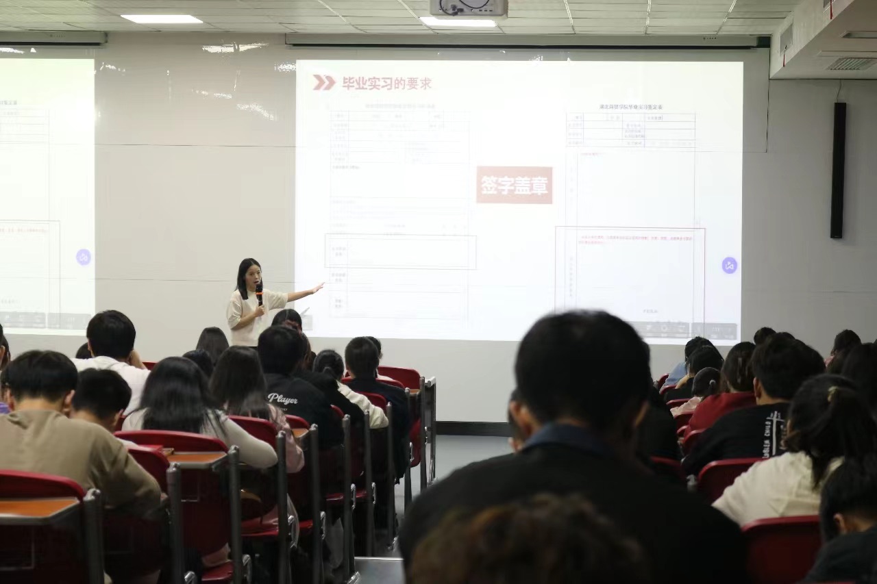 随后,张老师就毕业实习的方式、流程、要求等内容向学生做了详细说明,并结合自身经历与学生分享了实习中的注意事项。