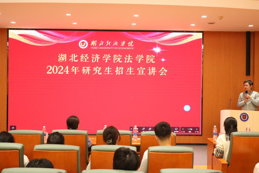 湖北经济学院法学院副院长王腾向大家介绍了学院办学成绩和教学水平现状,他从营商环境、绿色发展、实践教学特色等几个方面着重强调了湖北经济学院法律硕士专业特色和学院非法学专业学生的报考优势和发展前景。