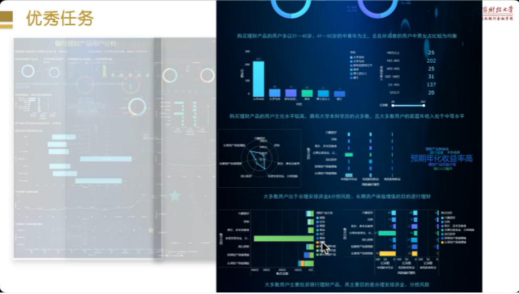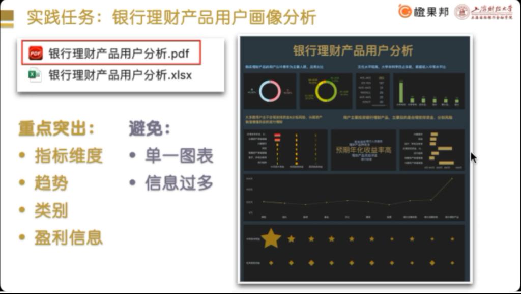 首先,李老师从数据分析流程、模型以及FineBI工具的运用等方面对整个毕业实习内容进行回顾总结,并通过银行理财产品用户画像分析案例强调数据分析在于从指标维度、趋势、类别和盈利信息四个角度进行重点突出,而不是呈现出所有信息,同时告诫学生要避免单一图表和信息过多问题的出现,应换位思考,简要而清晰地表达数据分析报告。
