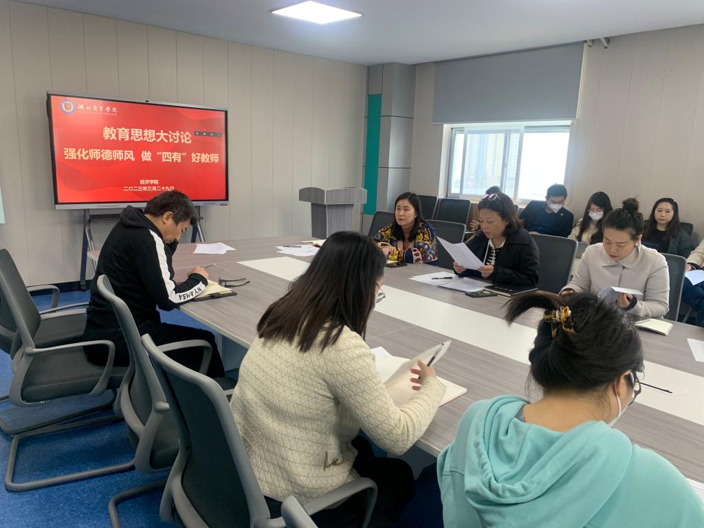 为进一步加强师德师风建设,不断增强学院教师教书育人的使命感和责任感,3月29日下午,经济学院围绕“强化师德师风 做“四有”好老师”专题召开思想大讨论。经济学院党总支书记吴俊、院长陈靓秋及全体教师参加座谈会。会议由党总支书记吴俊主持。