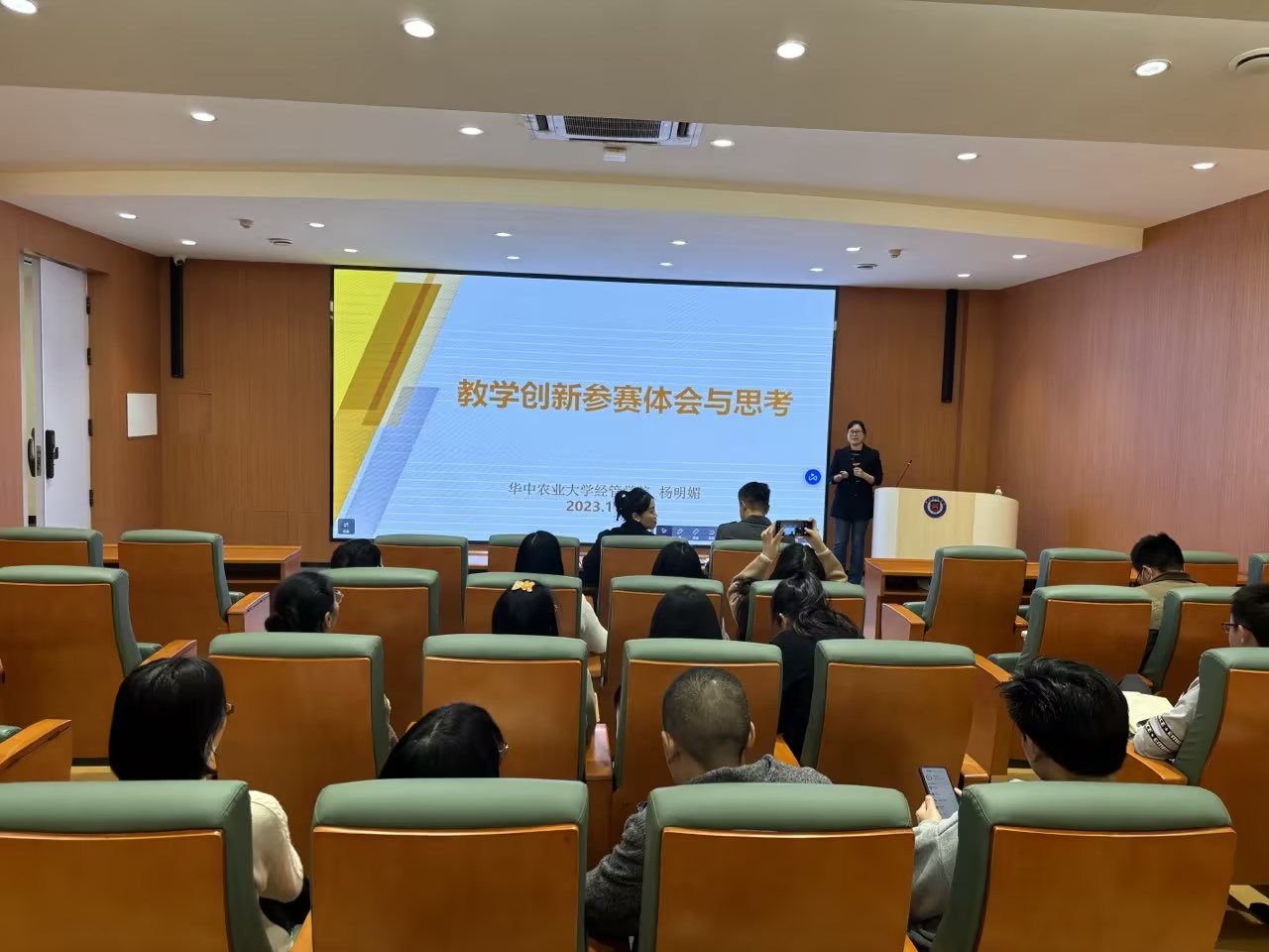 11月22日,经济讲坛系列讲座在图书馆报告厅举行,由华中农业大学杨明媚副教授带来了“教学创新大赛比赛体会与思考”的专题讲座,本次讲座由经济学院副院长盖卫东主持。