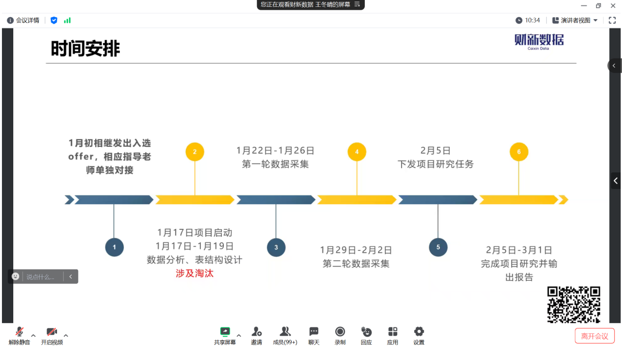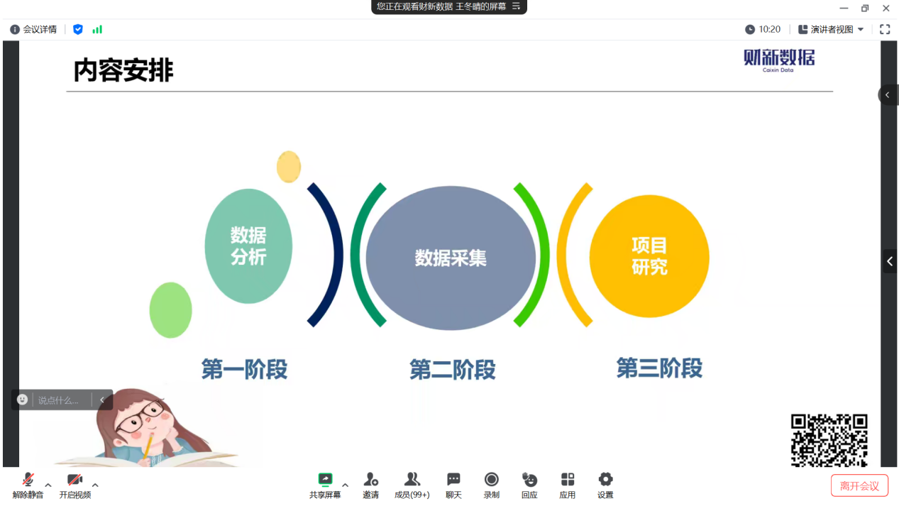 在会议开始,王冬晴对财新数据公司以及项目实习项目安排做了简单介绍,而后以提问的形式引出学生对于数据分析的理解,并以宏观经济数据为例,以现成数据库怎么做?数据源怎么找?优先采集哪个数据库?选用哪种频率的数据?采集手段选用人工还是AI?五连问的形式突显出了数据分析的复杂与神奇。