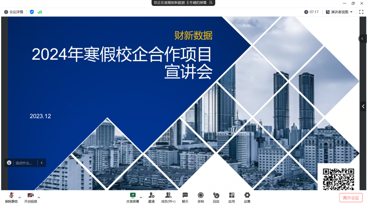 在成功举办暑期实践项目的基础上,经济学院与财新数据公司再度携手,于2023年12月28日,通过腾讯会议平台,成功启动了寒假校企合作实践项目——“ESG专题”宣讲会。本次宣讲会由财新数据公司数据分析部的王冬晴老师担任主讲人,吸引了经济学院2022级和2021级共计150余名学生踊跃报名参加。此次实践项目旨在深化学生对ESG领域的理解与实践能力,为未来的职业发展奠定坚实基础。