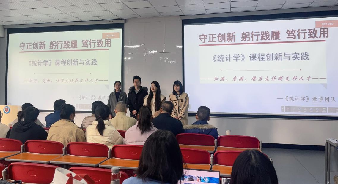 高爽老师本次《统计学》课程教学创新设计的主题为“守正创新 躬行践履笃行致用——培养知中国、爱中国、堪当民族复兴大任新时代文科人才”。首先,高爽老师展开课程创新实践汇报,围绕“四融四翼四结”教学创新模式,探索解决浅脱惑弱痛点问题,实现知识探究、能力培养、价值塑造三位一体的教学目标。接着,高爽老师从“全国平均工资”社会热点问题出发,激发同学们学习兴趣、展开讨论,并结合居民收入数据可视化图表,详细讲解了全国平均工资背后的集中趋势测度和偏态分布等知识点,同时将中美人均可支配收入进行了横向对比,警示当代青年实现中国式现代化建设任重而道远,有效为学生们打造真情、真感、真知的统计学教学创新课堂,培养学生成为堪当民族复兴大任新时代文科人才。