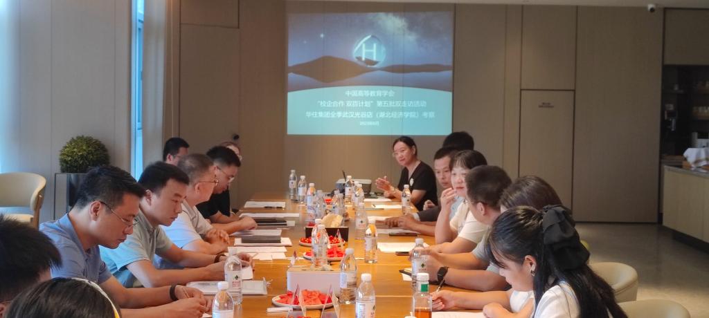 2023年8月3日,中国高等教育学会“校企合作 双百计划”第五批双走访活动在华住集团全季酒店(武汉光谷湖北经济学院店)展开。管理学院旅游教研室受湖北经济学院邀请,刘军和喻珍两位老师作为代表参加了本次交流学习。活动由湖北经济学院旅游与酒店管理学院蒋昕副院长主持。