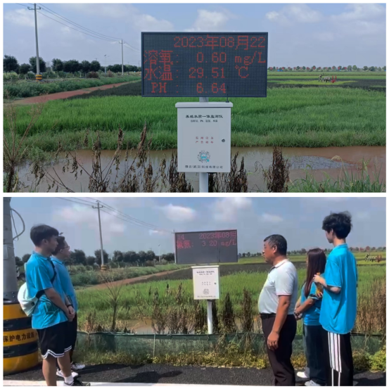 在途中,有个不断滚动播放的显示器吸引了我们的注意。在与柳书记交谈中得知,这是养殖水质一体监测仪,能够对当前水质的溶解氧、Ph、氨氮、水温进行严密地监测。方便养殖户实时掌握稻虾养殖水质的变化,以做针对性地调整,从而进行更加科学、规范的养殖小龙虾。