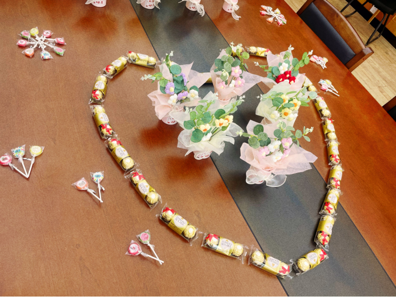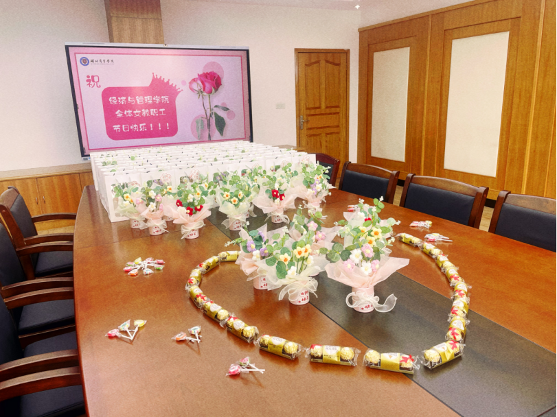 活动现场温馨而热烈,充满了节日氛围。桌上各色花朵精致绽放,巧克力、糖果琳琅满目,色彩鲜艳。经过充分调研,精心构思,学院为每位老师准备了实用的手工编织花和巧克力作为节日礼品。