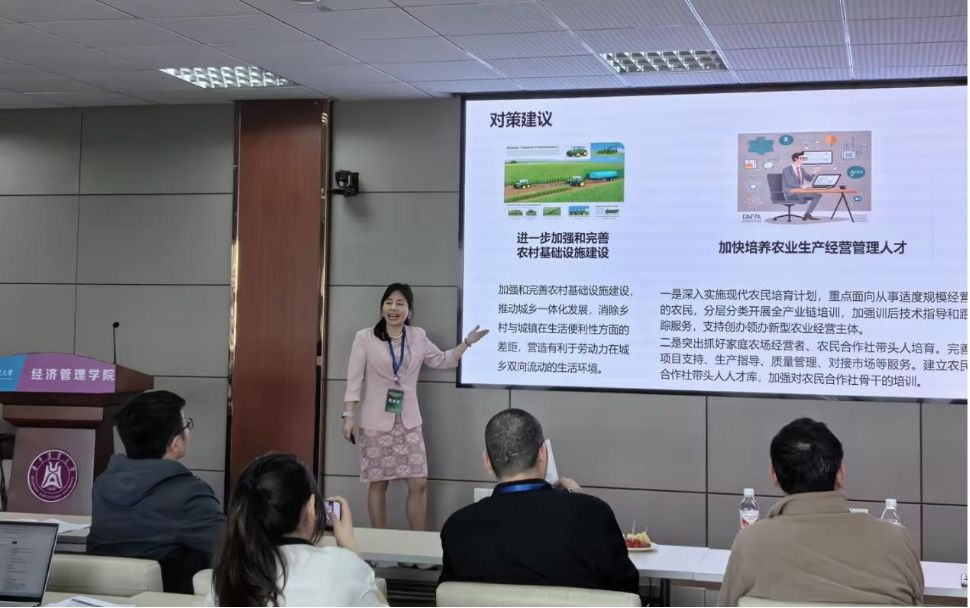 在农业政策分会场,十位青年学者轮番上台分享研究成果。学院教师卢红霞分享题为《“老年农业”趋势对智慧农业发展的障碍及对策研究——以江西省为例》的研究报告。