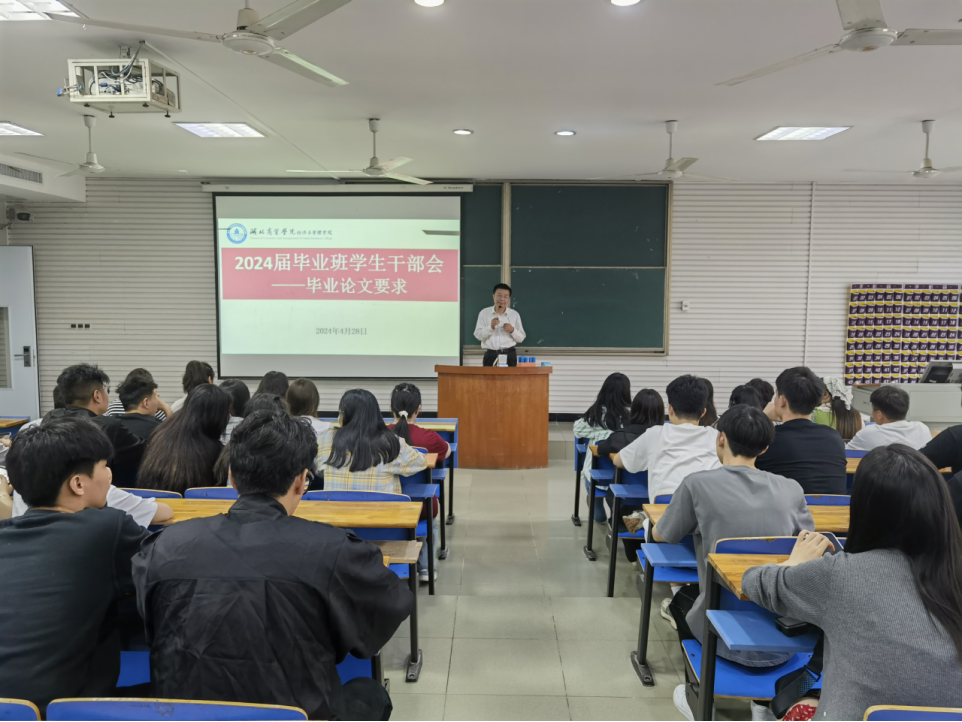 下午五点,严良在C201教室继续召集全体毕业班学生干部,就毕业论文要求进行再次集中强调。他首先代表学院全体教师对2024届本科毕业生表达美好祝愿,希望722位同学能顺利完成毕业论文答辩。同时就同学们毕业论文第一次答辩反映出的普遍性、突出性问题逐一进行讲解,要求学生干部会后召开班会集中传达会议精神,全体毕业生不断提高自我要求,以严谨、积极、认真的态度对照论文格式规范和答辩评委意见落实毕业论文的修改完善工作。
