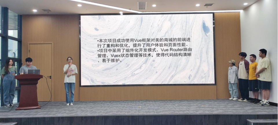 为展示实训成果,学生们中软国际报告厅开展项目成果展示答辩。考核汇报现场气氛热烈,各组成员纷纷展示他们的实训成果和心得体会。评委老师们认真听取每组同学的汇报,并针对他们的项目提出宝贵的意见和建议。中软国际的项目工程师们对同学们的表现给予较高评价,认为他们在较短时间内容掌握Vue框架的核心知识,并能够灵活运用到实际项目中,展现出较出色的学习能力和团队协作精神。