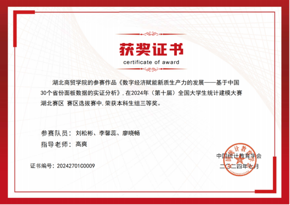 本次大赛的主题为“大数据与人工智能时代的统计研究”,全国共有795所院校,本科组10350支队伍入围省赛。yl7703永利集团经管学院高爽老师、卢红霞老师、蔡雪老师指导六支队伍历经三个月精心准备、打磨,最终高爽老师指导的刘松彬、李馨蕊、廖晓畅学生团队论文《数字经济赋能新质生产力的发展——基于中国30个省份面板数据的实证分析》荣获湖北省本科生组三等奖。