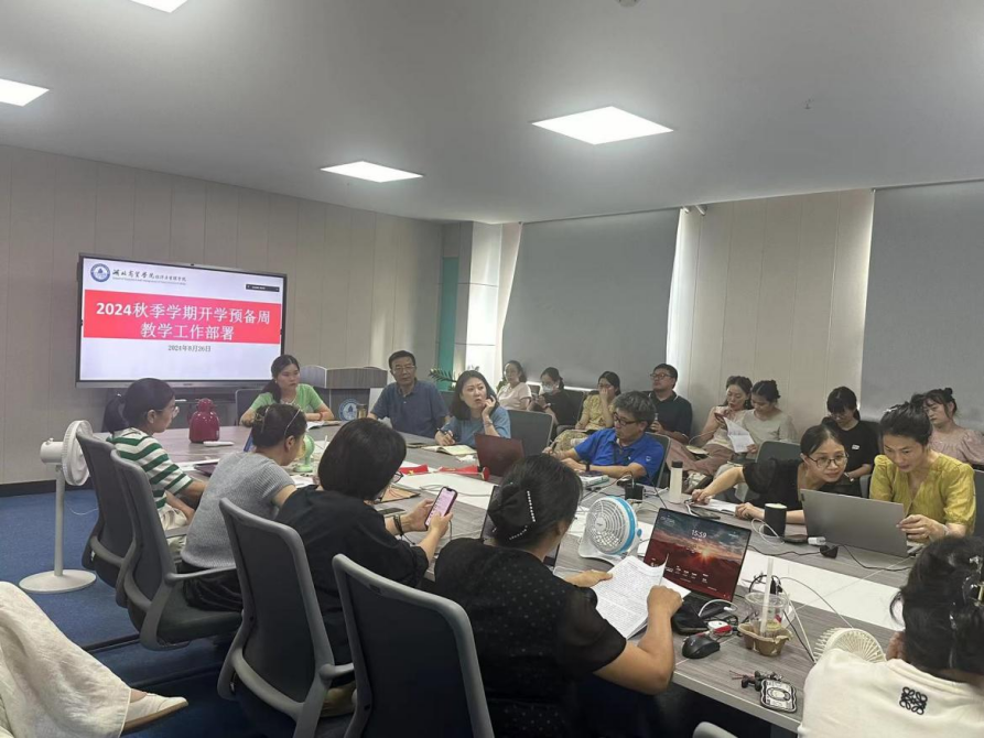 随后,孟静对近期的教学工作进行了部署和安排。她详细说明论文整改及开学前的各项准备工作。此外,她还特别提醒各位老师要注意教学“五带”——课程大纲、教案、授课计划、学生名册及教材,希望所有老师做好充分准备,另外,她还对新学期教学各项工作进度安排及教研活动进行介绍。