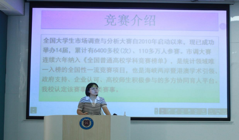 随后,专业教师黄春花对竞赛背景、参赛流程及奖项设置进行详尽介绍。同时,统计与大数据教研室主任高爽从大赛规则、企业命题、大赛注意事项等方面进行详细解读,并详细回答参会学生的提问。最后,往届市调大赛国赛获奖选手廖晓畅分享小组参赛经验及备战历程。