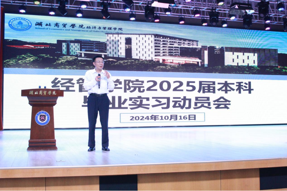 2024年10月16日,经济管理学院在荷香苑五楼报告厅举行2025届本科毕业实习动员会。本次会议由学院副院长孟静主持,学院院长严良、党总支书记王珉、副院长陈红兵、财新数据公司校企合作运营总监刘璐及负责人戴逸尘、学院全体教职工及2025届本科毕业生共同参加此次会议。