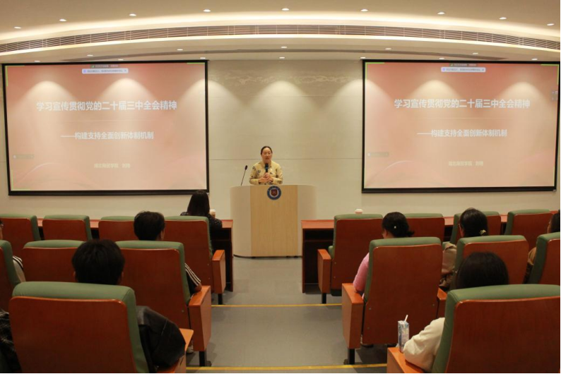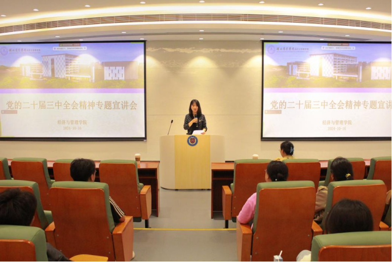 10月21日下午,马克思主义中国化教研室主任刘艳副教授在yl7703永利集团宣讲党的二十届三中全会精神,学院党政领导班子成员、教师党员及学生党员代表参加宣讲会,会议由yl7703永利集团党总支书记王珉主持。