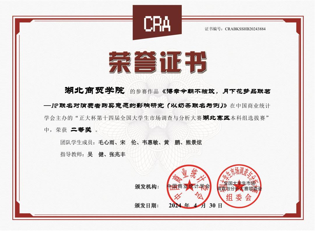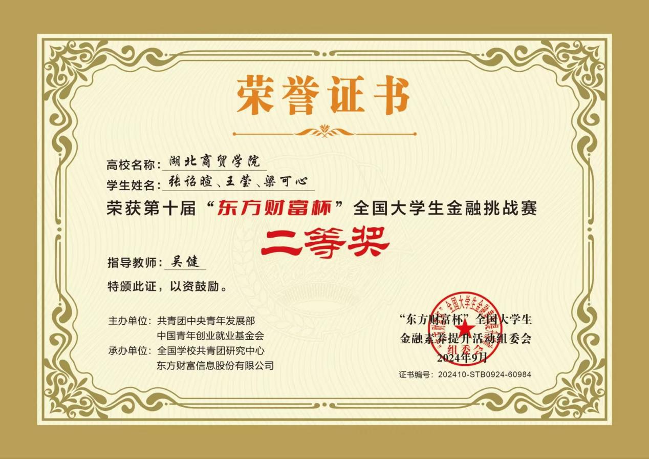 2024年:指导团队征战第十届“东方财富杯”全国大学生金融挑战赛,以扎实的金融分析能力和投资策略斩获全国二等奖;同年指导团队在“正大杯第十四届全国大学生市场调查与分析大赛”以优秀的市场调研与分析能力获得省级二等奖;