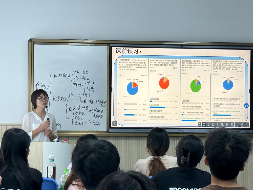 活动中,我院邓相花教授为22财管本1班讲授《民法》课程。邓教授的课堂教学注重理论与实践的结合,通过丰富的案例分析和互动讨论,使学生们能够更好地应用理论知识解决实际问题。她将复杂的民事主体理论以通俗易懂的语言呈现给学生们,引导学生深入理解民事主体的概念、分类和法律属性。课堂上,学生们积极参与讨论,与邓相花教授进行了一场思维碰撞和学术交流。在示范课后,邓相花教授还与新老师们分享了一些授课方法和心得体会。