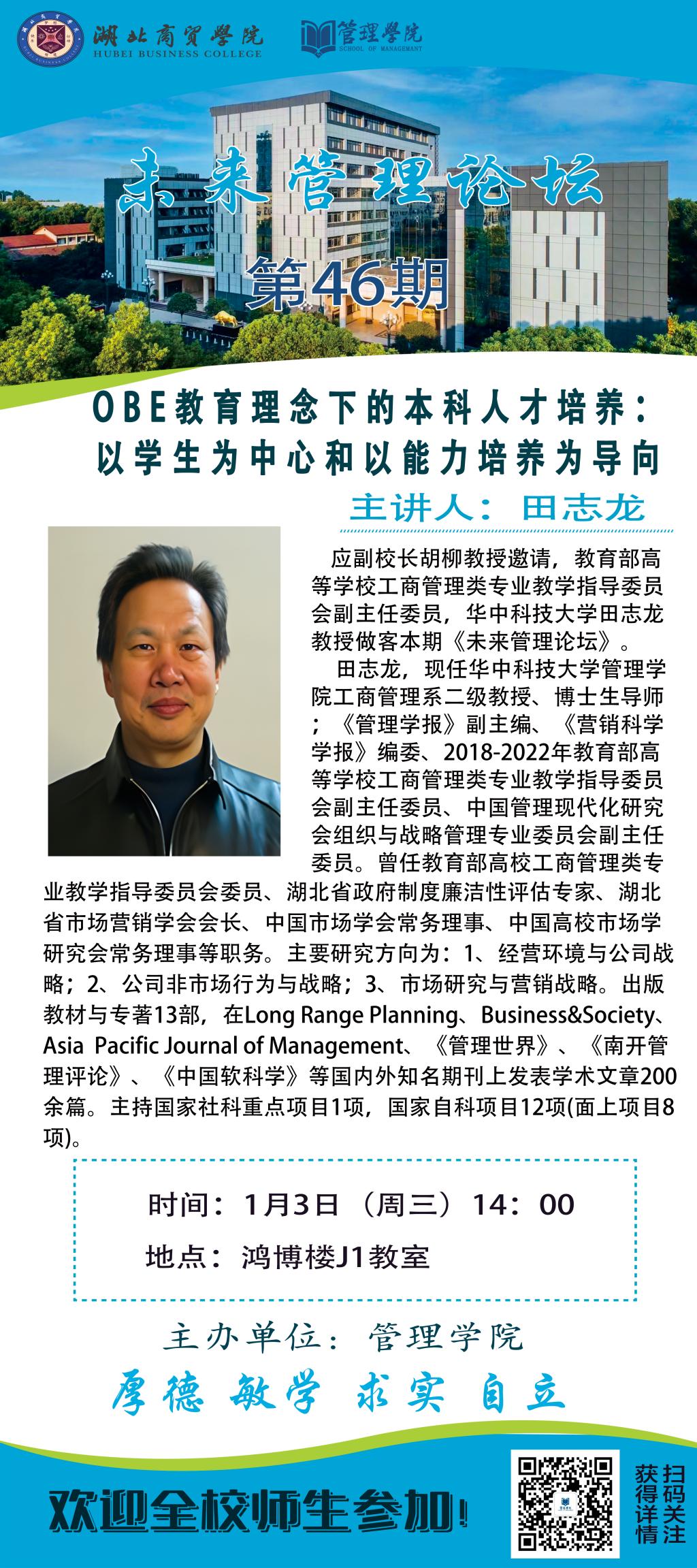 本期论坛邀请教育部高等学校工商管理类专业教学指导委员会副主任委员,华中科技大学田志龙教授,主题是:OBE教育理念下的本科人才培养:以学生为中心和以能力培养为导向。欢迎全校师生于1月3日(周三)下午14点00分做客鸿博楼J1教室。