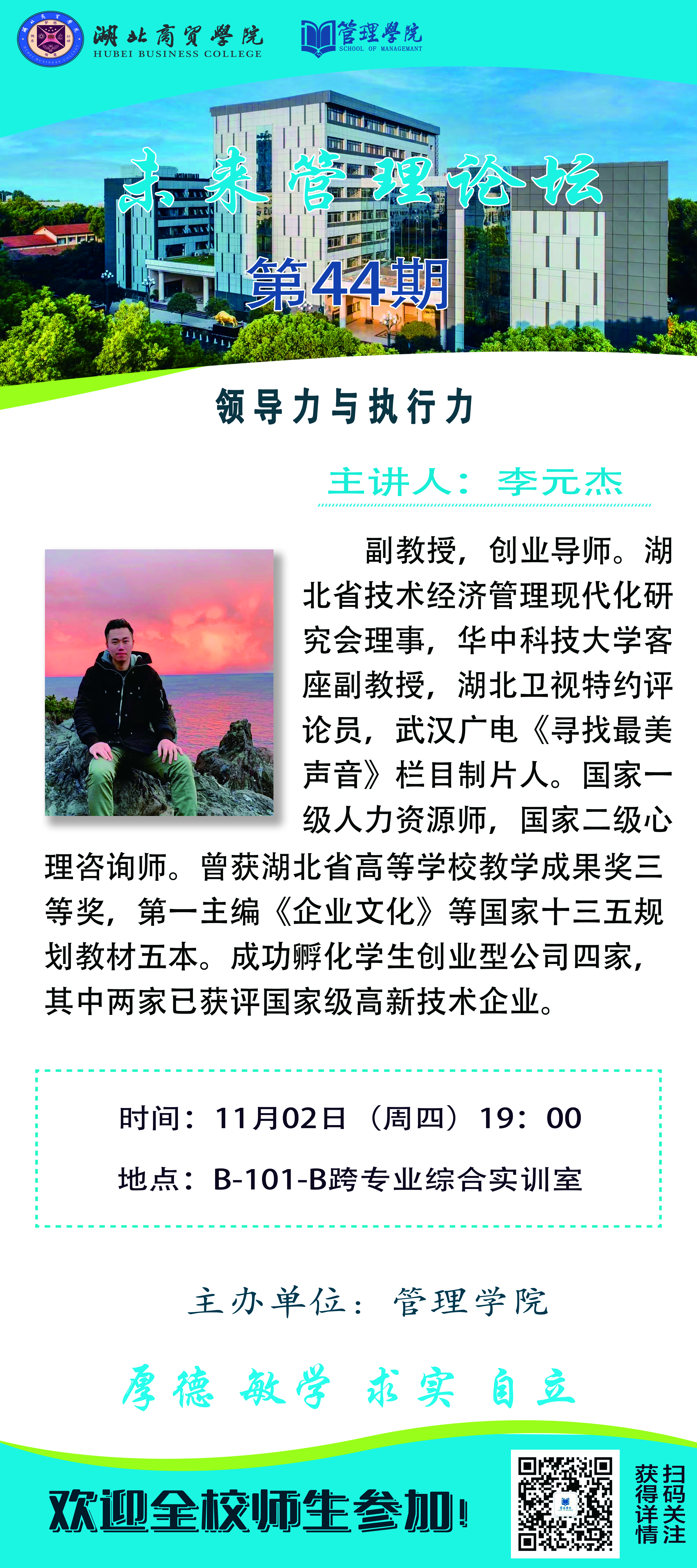 本期论坛邀请管理学院副教授、创业导师李元杰,主题是:领导力与执行力。欢迎全校师生于11月2日(周四)下午19点00分做客B-101-B跨专业综合实训室。