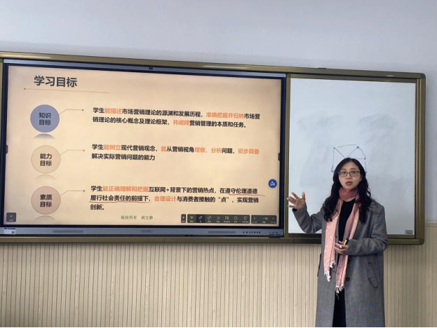 学院督导、专职教师胡文静以“2023年发生的爆款、热点及出圈事件”为例进行示范课展示,激发学生思考上述现象背后的营销力量介入,引导学生有兴趣、有信心学好《市场营销学》课程。