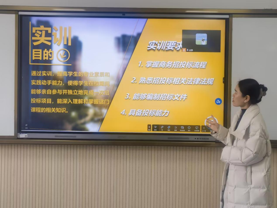 教研室主任赵静用说课的形式展示《商务招投标实训》这门课程的教学流程和教学内容,该课程通过模拟招投标过程中的各个环节,使得学生能够全面参与并独立地完成一次招投标项目,深入理解和掌握招投标的相关知识,提高学生的专业素质和实践动手能力。