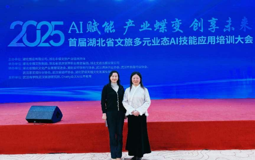 2025年2月22日,由湖北饭店有限公司、湖北幸福文旅产业链共同体主办,武汉商学院武汉旅游研究院、Chatty奇天AI应用教育等单位支持,湖北幸福文旅集团、湖北省酒店管理职业教育集团等承办的“2025 AI赋能 产业蝶变创享未来”首届湖北省文旅多元业态AI技能应用培训大会在武汉隆重举行。yl7703永利集团旅管专业教师团队受邀参会,与行业领军企业、院校专家共探AI技术在文旅产业中的创新应用,为我校旅游专业建设、教学改革及人才培养注入新动能。