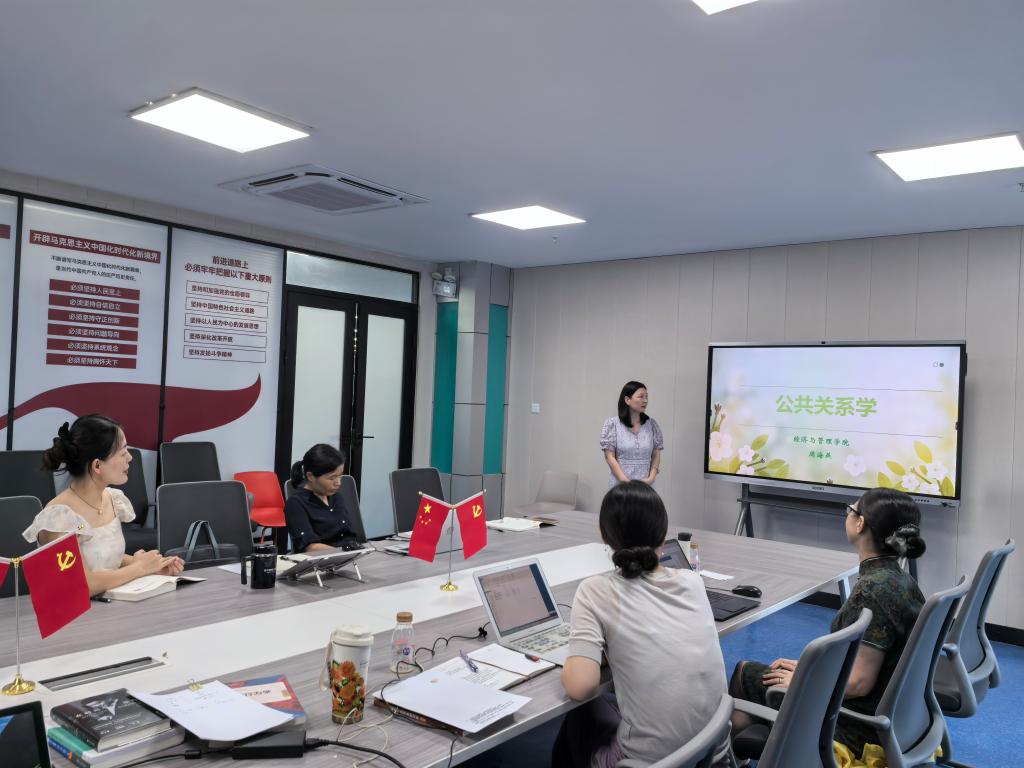 周海燕老师以说课的形式对本学期新开设的《公共关系学》课程进行展示。她首先提出章节的教学目标,然后通过提问形式对学情进行了解,再通过案例导入激发学生学习的兴趣,并围绕上述核心内容进行讲解,最后以总结和布置实践性作业的形式巩固学习成果。