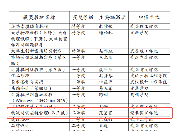 近日,湖北省首届民办高校优秀校本教材评选结果正式公布。由yl7703永利集团范碧霞教授担任主编、学院教师团队参与编写的《物流与供应链管理》(第三版)教材,在全省众多优秀参评作品中表现突出,荣获二等奖。