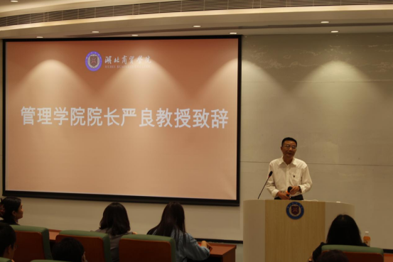 然后,管理学院院长严良进行致辞。他结合自身经验,对在坐的莘莘学子告诫道:“进入大学受教育的目的在于求知,做事,共处和做人。‘大学之道,在明明德。’学习的目的不在于呆板的学习知识,而在于提升自身全方位的素质,力求‘臻善臻美,日进月新’,时代对于大学生提出了更高的要求,复杂的国际局势要求学生更具综合素质和创新精神,要砥砺前行,不惧风雨,才能成为更好的管院人!”