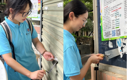 “一铲净”团队将目光聚焦在社区公共设施和居民楼的小广告上,自发进入社区进行小广告清理行动,手持铲子、刷子和清洁剂将乱贴乱画的小广告一张张拆除,恢复了社区的整洁和美观。不仅如此,团队成员们两两分组,将垃圾进行分类,同时给居民传递垃圾分类理念。