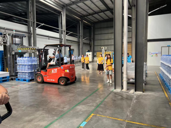 在车间内,我们可以看到全机械化的操作流程,一个车间从生产到物流装载只需要五六个人便可完成,团队的中物流专业同学在经过批准后,在物流车间还进行了部分的实践操作,对物流方面有了更加深刻的认识。