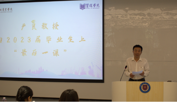 管理学院院长严良为2023届毕业生上最后一课,对于学有所成、顺利毕业的同学们致以了热烈的祝贺,对于辛勤耕耘、匠心育人的老师们表示了衷心的感谢。他希望同学们正视变化,日进月新,坚定信念,立鸿鹄之志。并衷心祝福毕业生们跃入人海、风雨灿烂、跨越山河、不染尘埃、前程似锦、一路顺风。