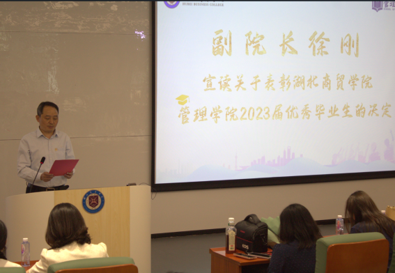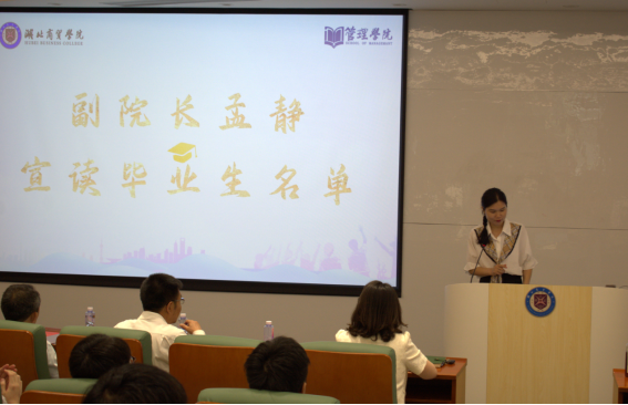 随后,管理学院副院长孟静宣读毕业生名单,管理学院副院长徐刚宣读关于表彰管理学院2023届优秀毕业生的决定。