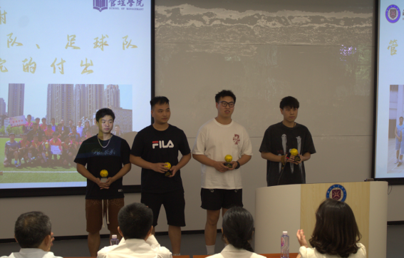 接着,团委书记胡泽华为管理学院篮球队、足球队的毕业生举行退役仪式,颁发定制奖杯和纪念品,感谢他们对于管理学院体育赛事的付出。