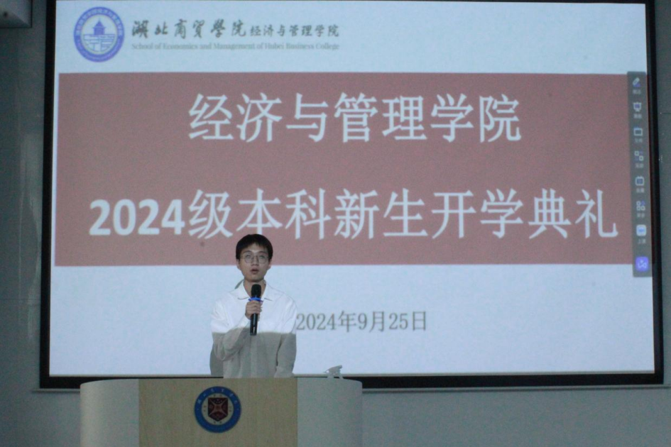 2022级电子商务专业的华威同学作为老生代表上台发言。他分享了自己两年的大学生活感悟,鼓励新生珍惜大学时光,积极参与丰富多彩的校园生活,勇敢追梦,不断超越自我。他的话语充满了对学弟学妹们的殷切期望和美好祝愿。