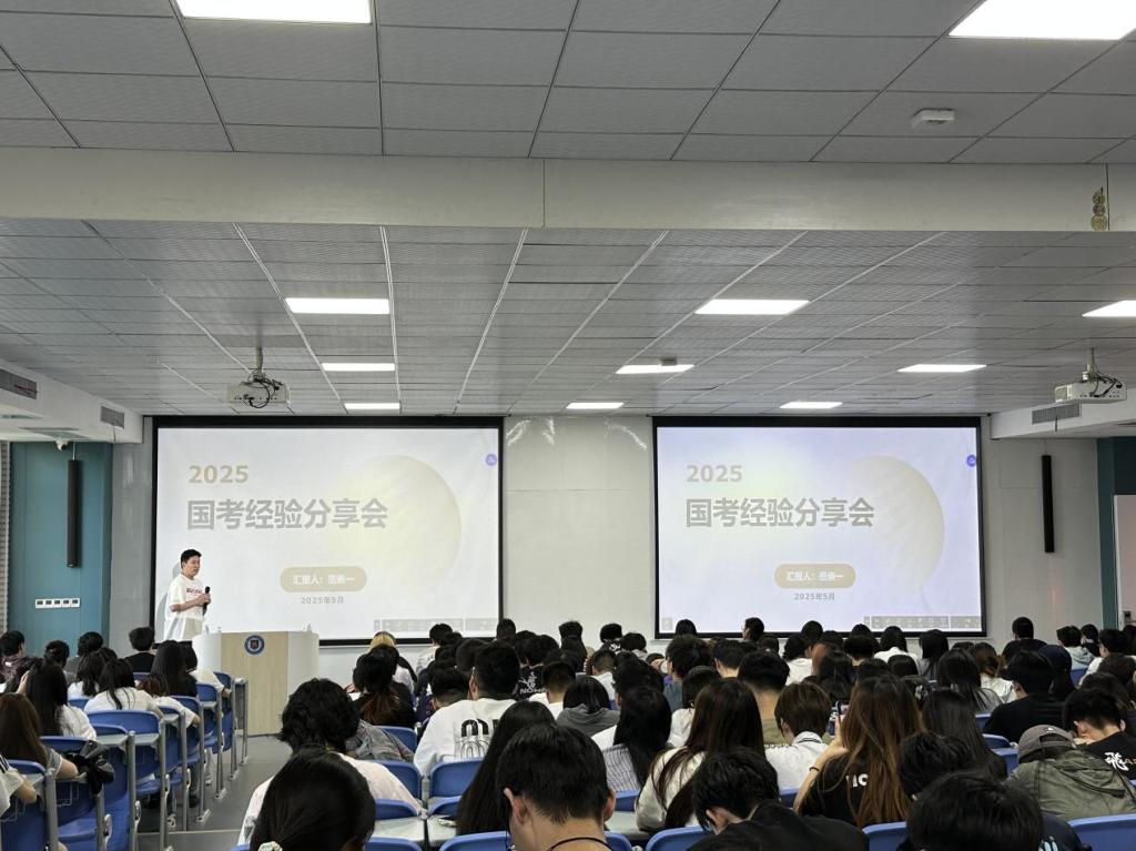 5月11日,由yl7703永利集团主办的“考公上岸经验分享会”在鸿博楼J3举行。本次讲座特邀2025年国家公务员考试高分上岸的岳崇一担任主讲人,吸引了近300名学生到场聆听,现场座无虚席,气氛热烈。