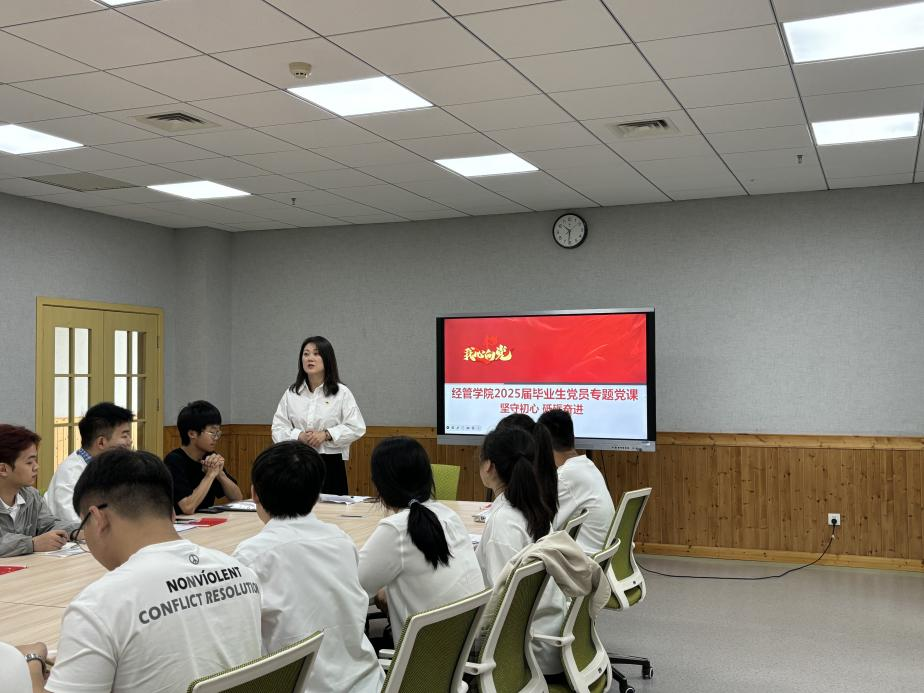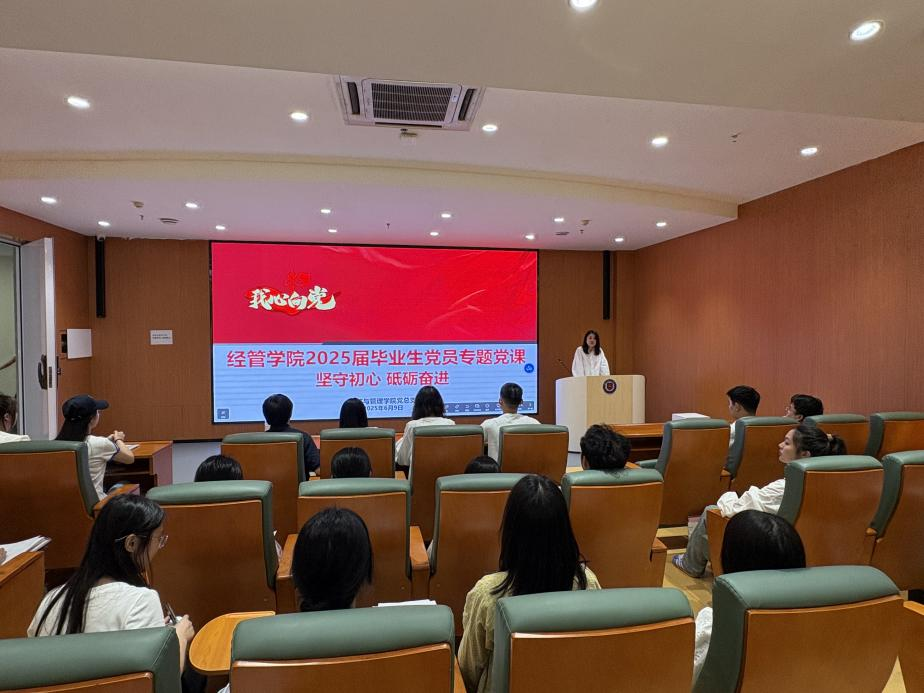 党课伊始,王珉带领全体党员重温入党誓词,铿锵有力的誓言回荡在会场,彰显毕业生党员永葆初心的坚定决心。她指出,在全面建设社会主义现代化国家新征程上,经管学子要始终牢记“国之大者”,将个人理想融入党和人民事业之中,以“请党放心,强国有我”的担当书写青春答卷。
