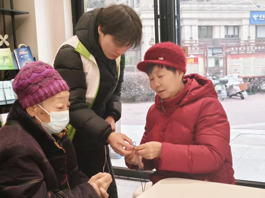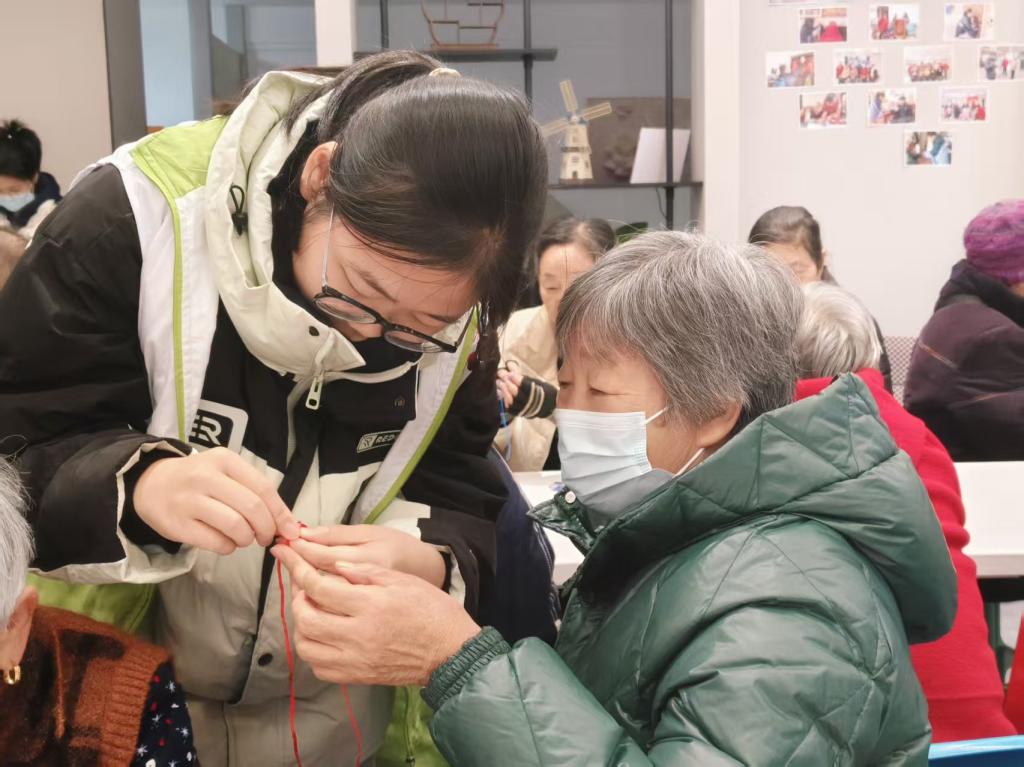 最具人气的是“平安守护”金刚绳手工制作环节。志愿者提前备好彩色金刚绳、配饰等材料,手把手指导老人们穿线、打结、编织、收尾,细致讲解每一个步骤。老人们兴致盎然,专注学习编织技巧,互相交流经验,活动现场气氛热烈而温馨。活动尾声,老人们佩戴着亲手制作的金刚绳手绳,脸上洋溢着满满的成就感与幸福感,纷纷与志愿者合影留念,定格温馨瞬间。