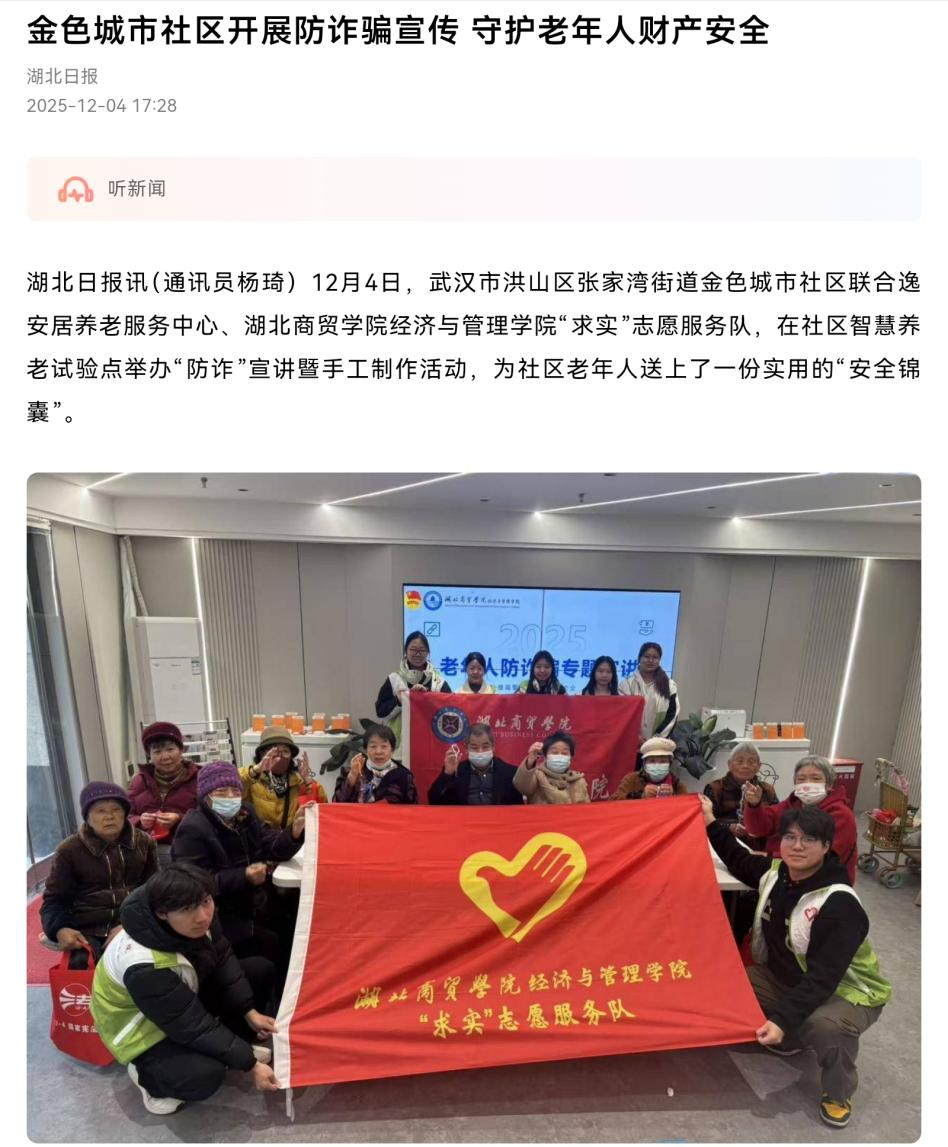 金色城市社区负责人全程参与活动,对此次志愿服务给予高度评价:“在国家宪法日这个特殊的日子里,‘求实’志愿服务队不仅把防诈和法治知识送到老人身边,还带来了有趣的手工活动,既实用又暖心,真正做到了为老年人办实事、解难题!”。据悉,本次暖心志愿活动已入选《湖北日报》报道,传递校社联动的正能量。